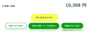 「結果をPDFで出力」して一度検討をする、または「見積り結果についてお問合せ」することもできます。